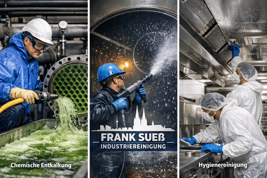 Frank Sueß Industriereinigung ist Ihr erfahrener Partner für professionelle Industriereinigung in Köln und Umgebung. Wir bieten spezialisierte chemische Entkalkung, Hochdruckreinigung und gründliche Hygienereinigung industrieller Anlagen von Dampfkesseln bis Lüftungssystemen. Mit modernster Technik, qualifiziertem Fachpersonal und maßgeschneiderten Reinigungslösungen steigern wir Betriebssicherheit, Performance und Lebensdauer Ihrer Industrieanlagen. Unsere Arbeit minimiert Ausfallzeiten, reduziert Wartungskosten und sorgt für höchste Sauberkeit nach branchenspezifischen Standards. Ob regelmäßige Wartung oder akute Spezialreinigung – wir reagieren schnell, zuverlässig und kundenorientiert. Profitieren Sie von einem kompetenten Reinigungsservice, der Effizienz, Sicherheit und hygienische Sauberkeit vereint.